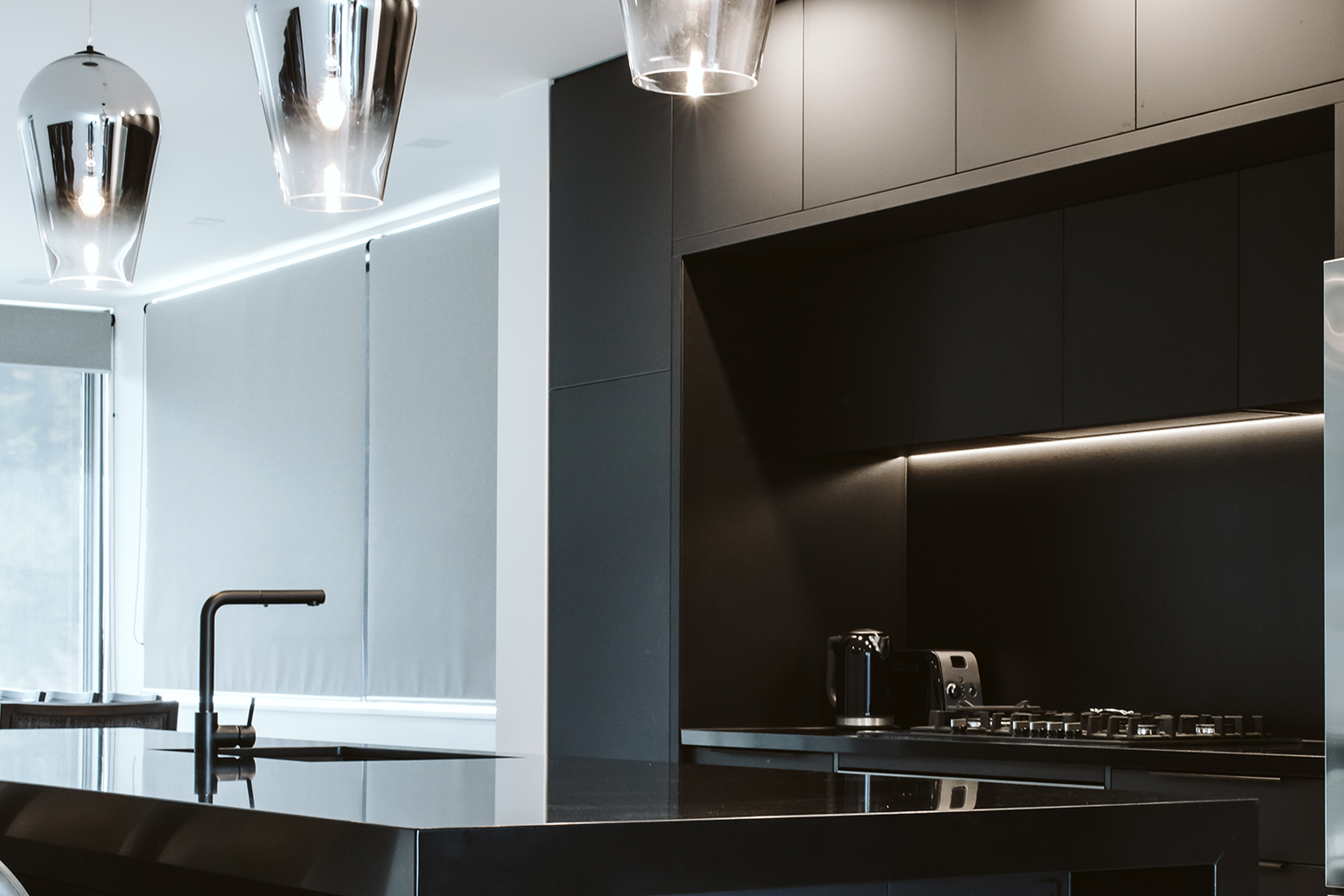 The NZ Panels Group showroom at the Home Ideas Centre in Parnell has two matt finishes used on hero cabinetry within the space - Nitro on the main island unit drawers and Neo Glacier on the tall cabinetry adjacent to the display case.